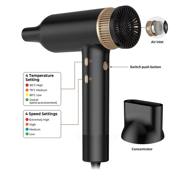Feature: Small but powerful, high speed brushless motor and fast blow drying, equipped with 110,000 RPM high speed brushless motor. Powerful airflow dries hair in no time.Equipped with negative ion technology, it effectively locks in moisture and leaves your hair soft and frizz-free.Features auto-clean technology that reverses the rotation of the turbine to deep clean the filter.